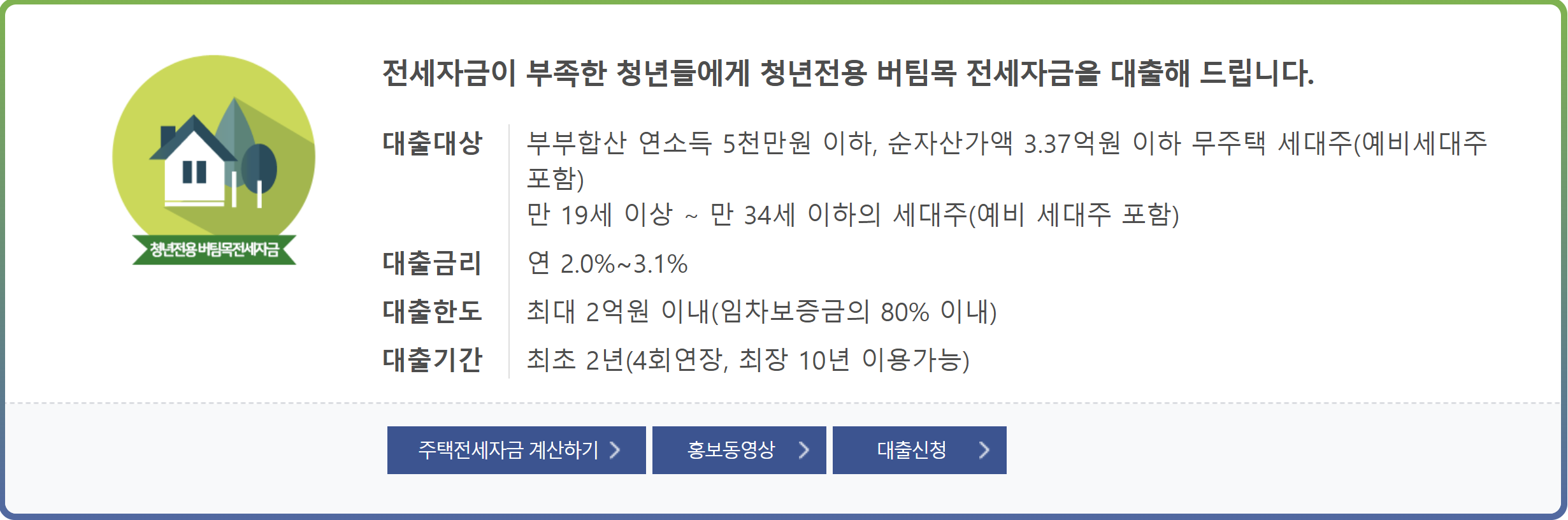 청년 버팀목 전세대출은 말 그대로 전세자금이 부족한 청년들을 대상으로 전세자금을 대출해주는 상품입니다.