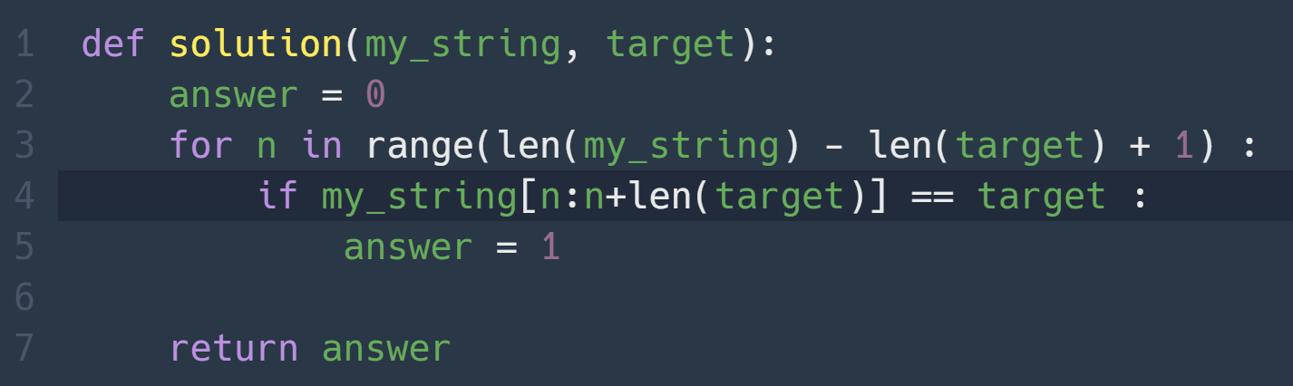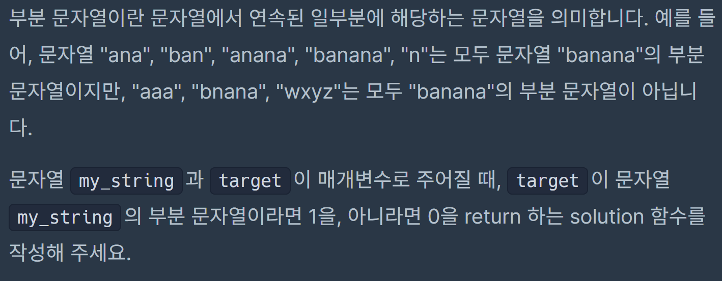문제를 요약하자면 주어진 my_string 문자열의 부분 문자열중에 내가 찾는 target이 있냐 라는 것이다.